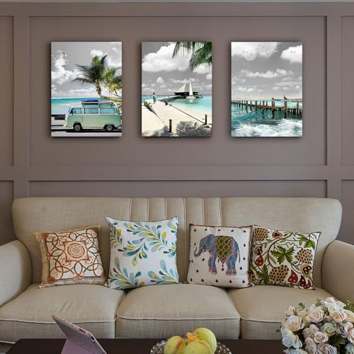 Acocifi - لوحة فنية جدارية مصنوعة من القماش بتصميم المحيط بلون فيروزي والشاطئ وأشجار النخيل بلون أخضر فاتح في فصل الصيف مقاس 30 × 40 × 3 سم تصلح لتزيين الحمام وغرف النوم والمعيشة والمكتب المنزلي من اكوسيفي