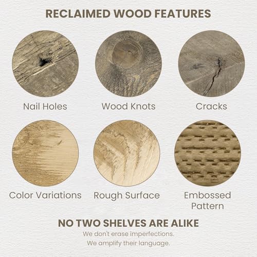 - خشب أصلي مستصلح وشخصية فريدة: مصنوع من خشب أصلي مستصلح، يتميز كل رف بسحر ريفي مميز مع عقد طبيعية وتنوعات حبيبية ولمسات نهائية مزخرفة. استمتع بالأناقة المستدامة مع إضافة الدفء والشخصية إلى ديكور منزلك. كل قطعة فردية حقًا.