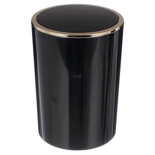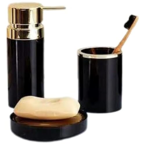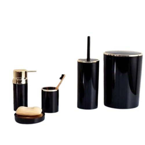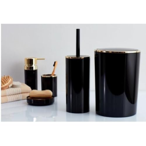 Generic - أكسسوارات حمام أكريليك مكونة من 5 قطع (كوب حامل فرشاة الأسنان، سلة مهملات 6 لتر، موزع صابون لوشن (300 مل)، صبانة، فرشاة تواليت) حلقة ذهبية (أسود)