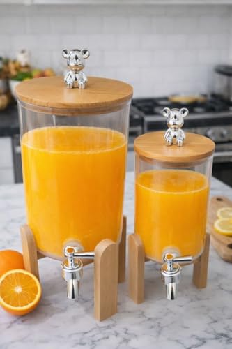Aucma - موزع مشروبات اكريليك مع حامل خشبي، غطاء خيزران مع تمثال دب، حنفية كروم، لتقديم مشروبات العصير (3 لتر)