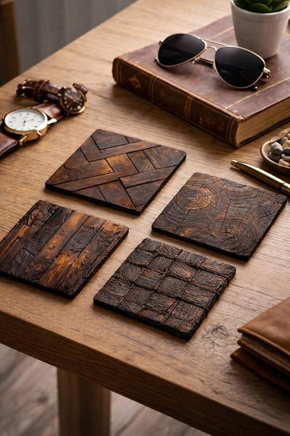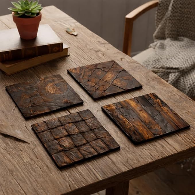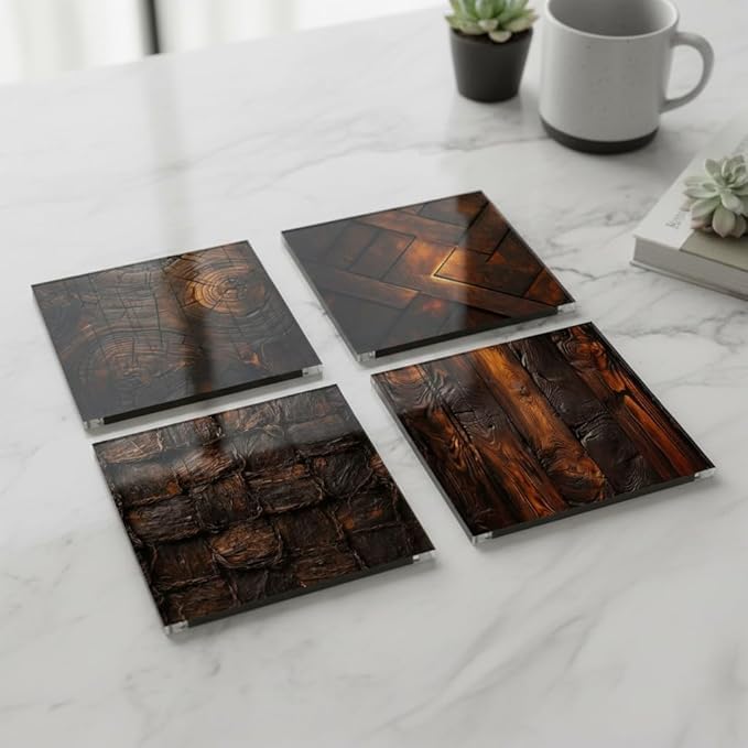 Generic - قاعدة اكواب اكريليك فاخرة من الخشب الداكن بنمط ريفي 9 سم (مجموعة من 4 قطع) | قواعد اكواب مشروبات مزخرفة فاخرة | حصائر كريستال شفافة مقاومة للحرارة - واقي طاولة عصري للمنزل والمكتب