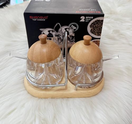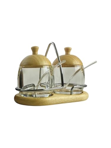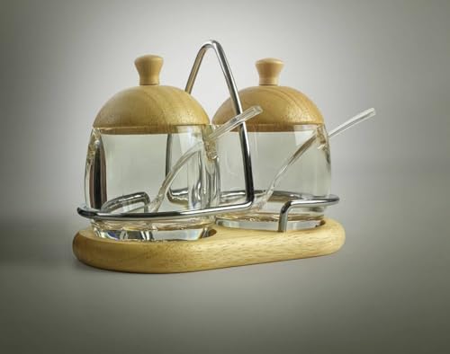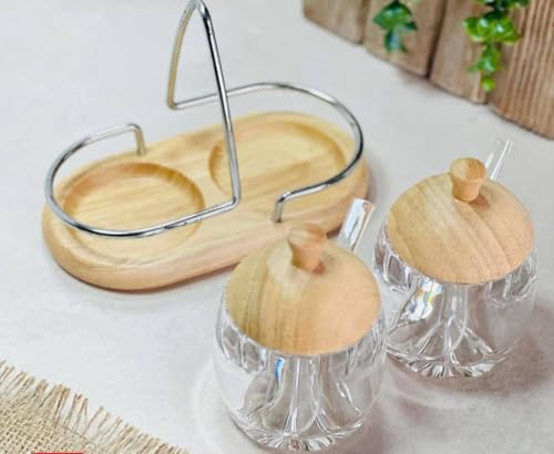 Generic - طقم سكرية أنيق من الأكريلك – 2 سكرية بغطاء خشبي + قاعدة خشب + حامل ستانلس + ملاعق