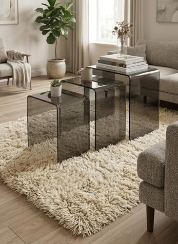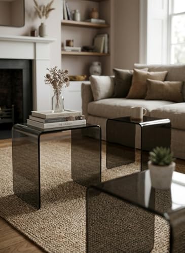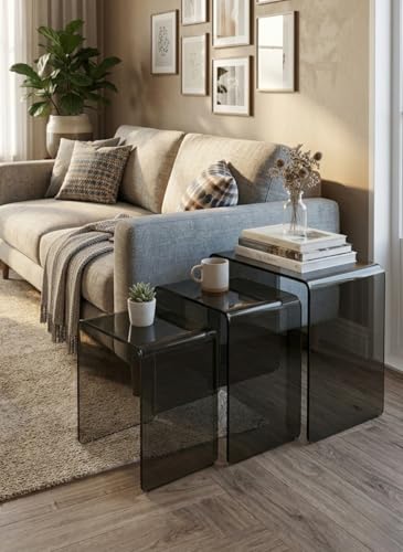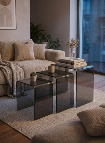 - [تصميم فاميه راقٍ]: صُنعت هذه الطاولات من الأكريليك الفاخر المصبوغ باللون الرمادي (الفاميه/المدخن)، مما يمنحها مظهراً عصرياً يضيف عمقاً لديكور منزلك مع الحفاظ على إحساس الخفة والرحابة في المكان.