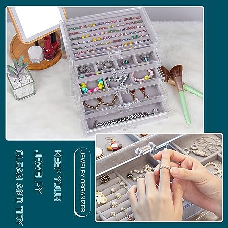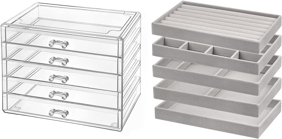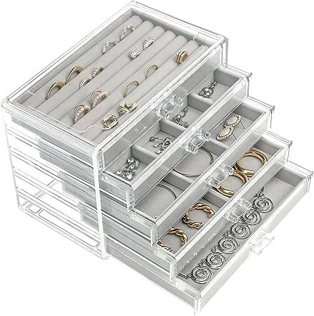 Generic - صندوق مجوهرات من الاكريليك منظم مخملي بادراج شفافة حافظة عرض اقراط وساعات وأساوروخواتم قابل للتعديل للنساء لون رمادي 5 ادراج