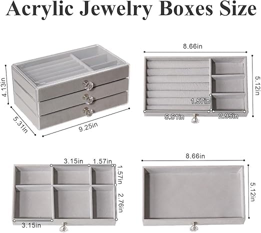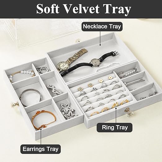 - صندوق مجوهرات مخملي مع 3 أدراج: جزء داخلي مبطن بالكامل لجعله يبدو أنيقًا ويوفر حماية أفضل لمجوهراتك.