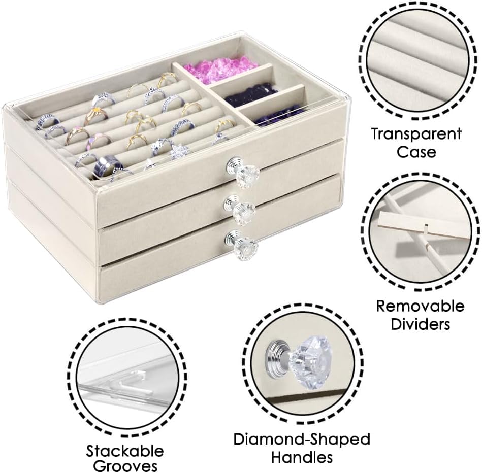 - منظم مجوهرات فاخر من 3 طبقات مصنوع من أدراج مخملية ناعمة داخل هيكل أكريليك شفاف للغاية. تحافظ على الخواتم والأقراط والقلائد والأساور مرتبة بشكل مثالي مع إضافة الأناقة إلى طاولة الزينة أو خزانة ملابسك.