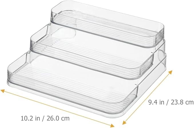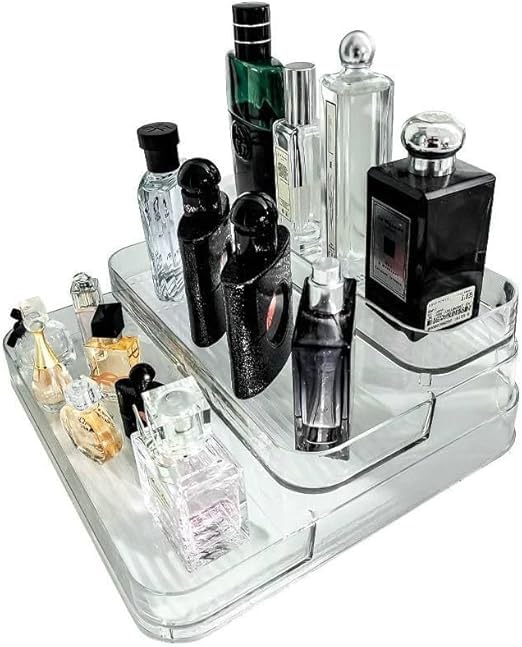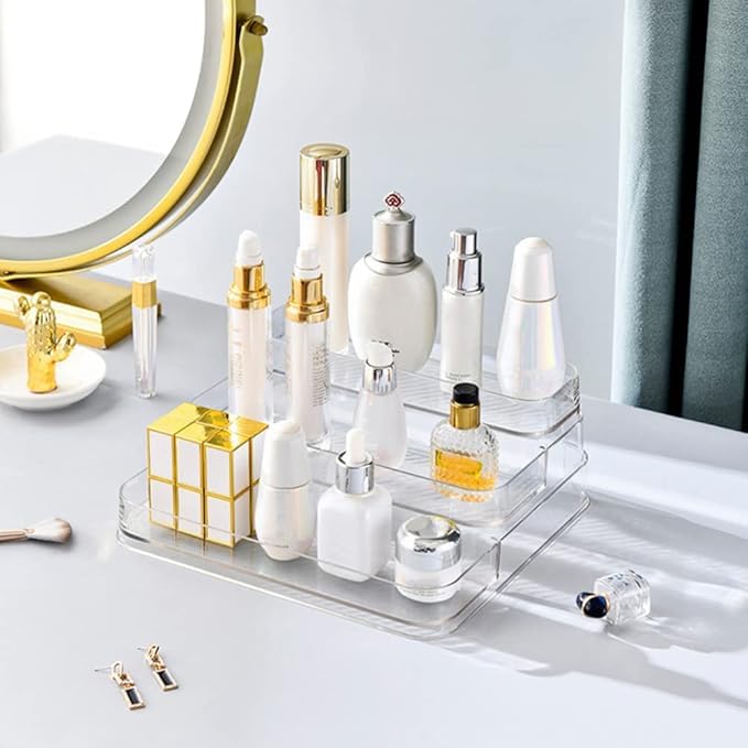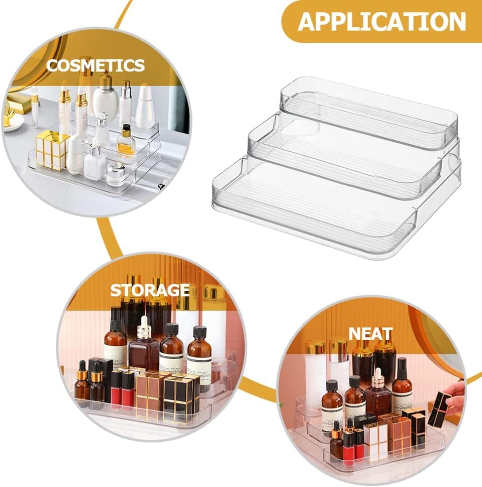 - تصميم متدرج من 3 طوابق: منظم أكريليك شفاف بتصميم سلمي يوفر رؤية واضحة لجميع محتوياتك ويسهل الوصول إليها بسرعة