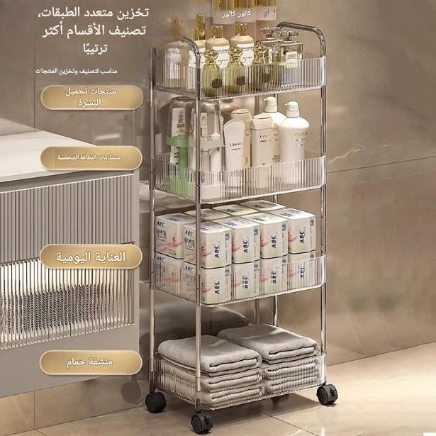 - توفر هذه العربة الدوارة متعددة الاستخدامات المكونة من أربع طبقات سعة تخزين استثنائية للحمامات أو المكاتب أو المطابخ. توفر أرفف الأكريليك الشفافة رؤية واضحة للمحتويات بينما يضمن الإطار المعدني القوي متانة تدوم طويلاً ومقاومة للصدأ. يزيد التصميم العمودي من مساحة التخزين دون أن يشغل مساحة كبيرة، مما يجعله مثاليًا للمناطق الصغيرة. عجلات دوارة سلسة تسمح بحركة سهلة بين الغرف، مما يتيح وضع مرن أينما كان التنظيم