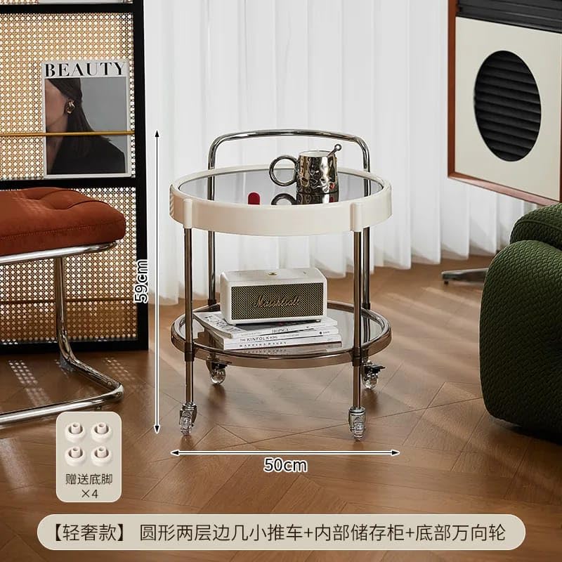 - التصميم: عربة تقديم ضيافة دائرية الشكل مصنوعة من الأكريلك الشفاف بطبقتين لتنظيم وعرض المستلزمات بأناقة