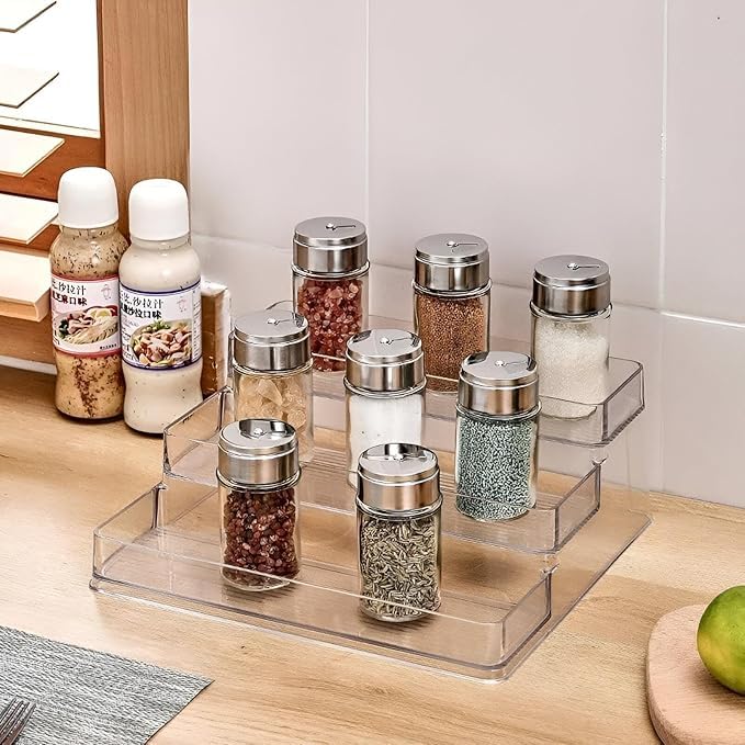 - سواء تم استخدامه لتخزين صلصة الصويا أو الخل أو الملح أو برطمانات التوابل، يمكن وضع هذا المنظم العملي المكون من ثلاث طبقات على أسطح الطاولات أو داخل الخزانات أو الأرفف، مما يضمن بقاء منزلك أنيقًا ومنظمًا.