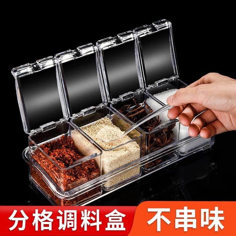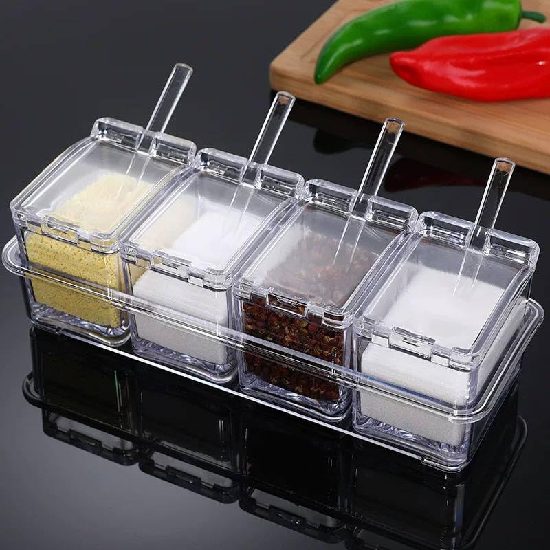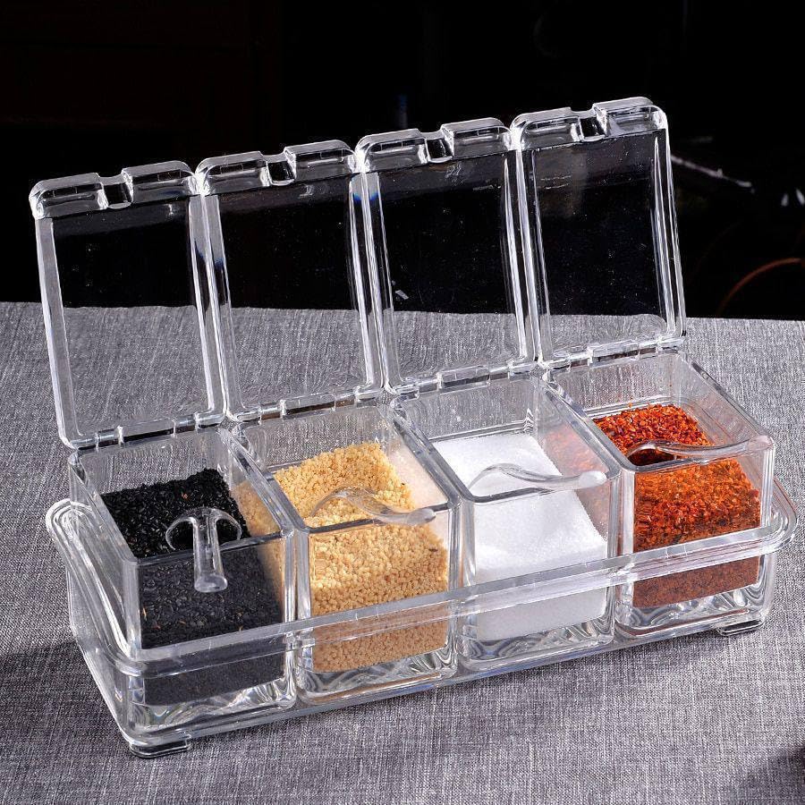 - مزايا التصميم: مجموعة علب توابل اكريليك شفافة مع 4 مساحات تخزين فردية، كل منها يتميز بغطاء مفصلي وملعقة تقديم مخصصة