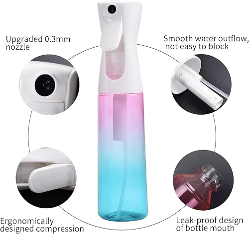 - استمتع برذاذ مستمر فائق الدقة من فوهة 0.3 ملم توفر رذاذًا سلسًا ومتساويًا. الضغط الخفيف ينتج رذاذًا مستمرًا لمدة 2 إلى 3 ثوانٍ، بينما يتيح لك التصميم بزاوية 360 درجة الوصول إلى كل زاوية وزاوية، مما يجعله مثاليًا للتصفيف الدقيق ورش العناية بالبشرة ولمسات المكياج والمهام اليومية دون قطرات أو هدر.