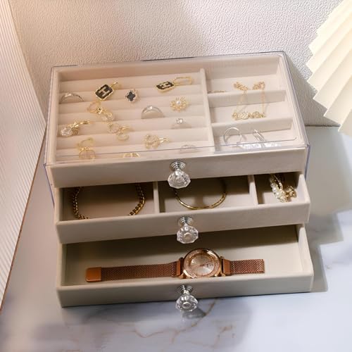 - يتميز منظم المجوهرات العصري هذا بتصميم أكريليك شفاف مع ثلاثة أدراج منزلقة سلسة، مما يجعل من السهل الوصول إلى إكسسواراتك المفضلة وتخزينها. تسمح المقابض المصبوبة بإزالتها بدون مجهود، مما يضمن لك الحصول على ما تحتاجه بسرعة دون أي متاعب. لا يعرض الجزء الخارجي الشفاف مجوهراتك بشكل جميل فحسب، بل يسمح لك أيضًا برؤية الترتيب في لمح البصر، مما يجعله إضافة عملية لمنطقة الملابس الخاصة بك.