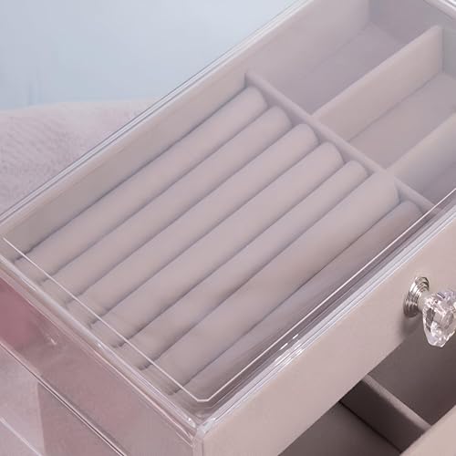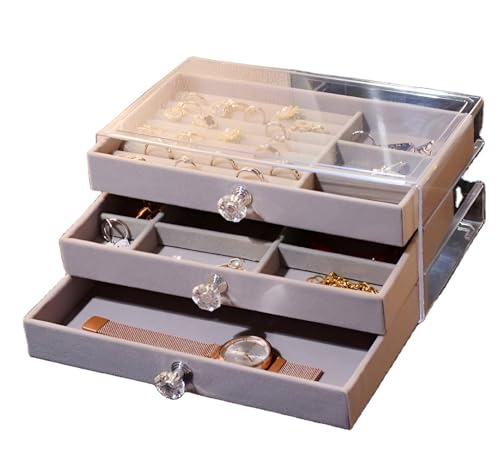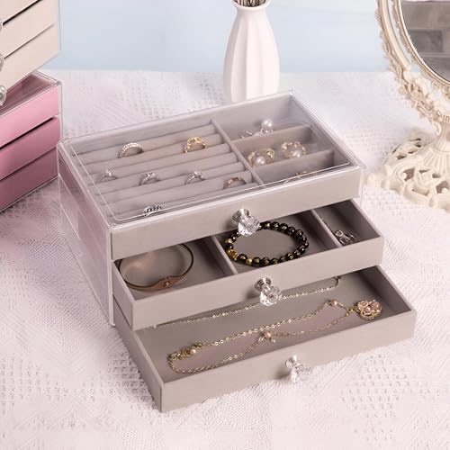 Generic - صندوق تخزين اكريليك - منظم مجوهرات انيق ثلاثي الرسم بتصميمات مخملية، مثالي لحفظ الاقراط والاساور والقلائد والخواتم والدبابيس مرتبة بدقة (لون رمادي)