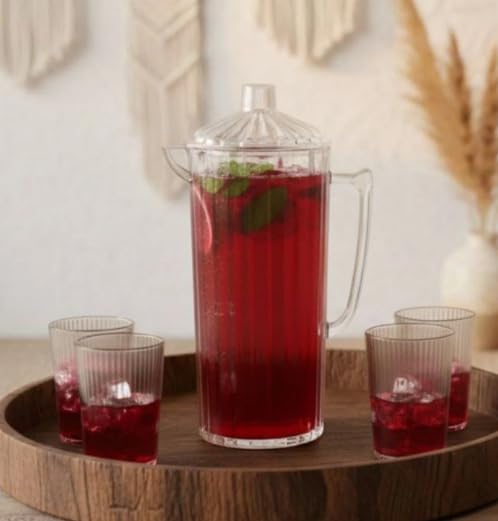 - ✅【طقم كامل 5 قطع】يشمل الطقم دورقًا واحدًا وأربعة أكواب متناسقة الحجم والشكل، ما يضمن ترتيبًا مثاليًا للمشروبات على الطاولة دون الحاجة لأدوات إضافية، مع توفير سهولة الوصول لكل كوب وتنظيم مرتب يعكس الذوق الرفيع ويضيف لمسة من الترتيب والأناقة أثناء تقديم العصائر والمياه للضيوف أو الأسرة. 🍹