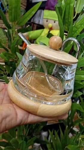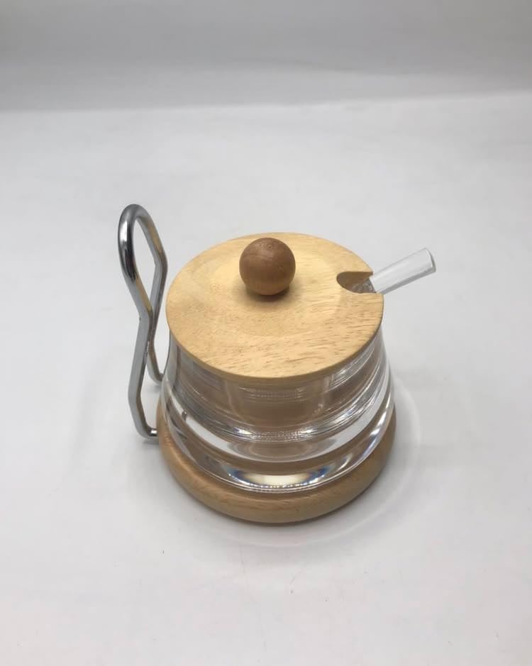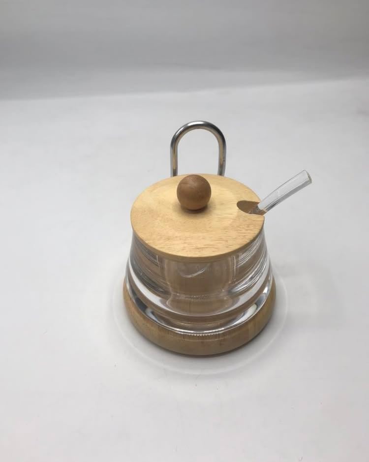Happy Home - وعاء سكر اكريليك مع ملعقة مصنوعة من نفس المادة وغطاء من الخشب بتصميم انسيابي لسهولة الاستخدام من هابي هوم