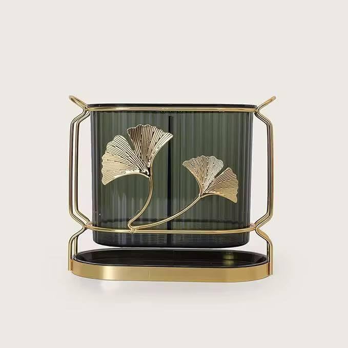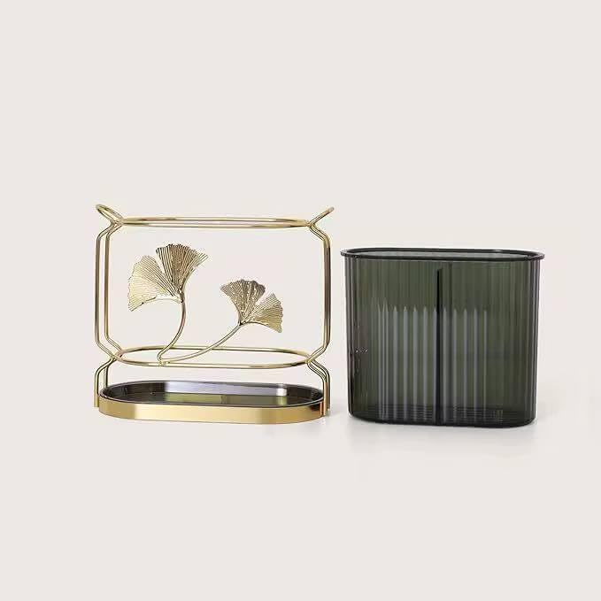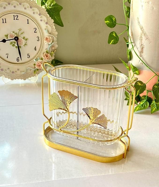 - حامل أدوات من الاكريليك لطاولة المطبخ، حامل أدوات صغير مكون من قسمين لتنظيم وتخزين أدوات الطبخ - علي حامل معدن جولد بصينية في الأسفل لسهولة التصريف والتنظيف بسهولة