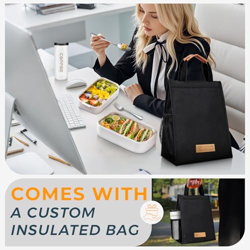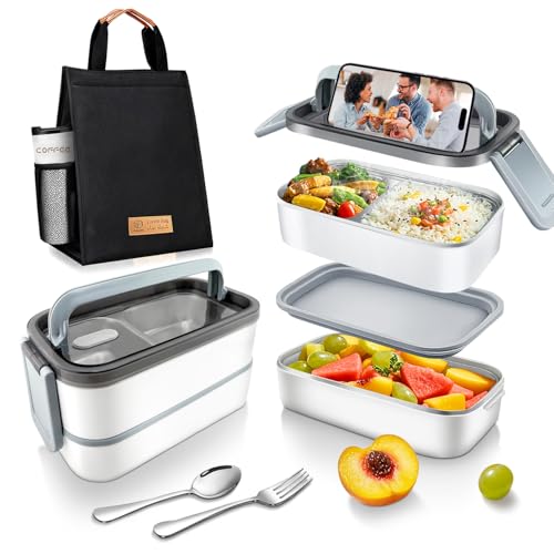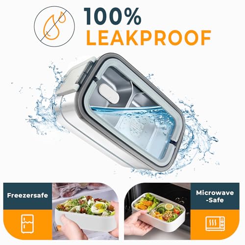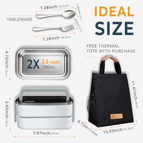 Adando - صندوق بينتو من الستانلس ستيل 304 محمول مع اغطية من اداندو، صندوق غداء عازل للحرارة مزدوج الطبقة، صندوق غداء مقاوم للتسرب، صندوق غداء لتسخين فرن الميكروويف للبالغين (ابيض)