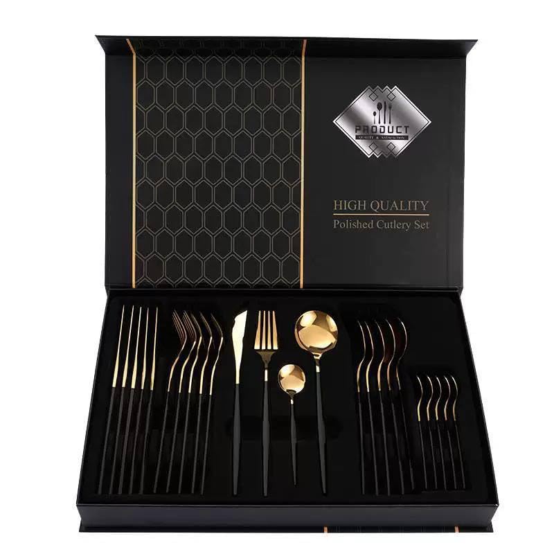 "أضف لمسة فاخرة لمائدتك مع طقم معالق 24 قطعة ستانلس ستيل (6 شوك _6 سكاكين _6 معالق كبيرة _6 معالق صغيرة) بألوان وأشكال عشوائية – من TRUST.STORE"