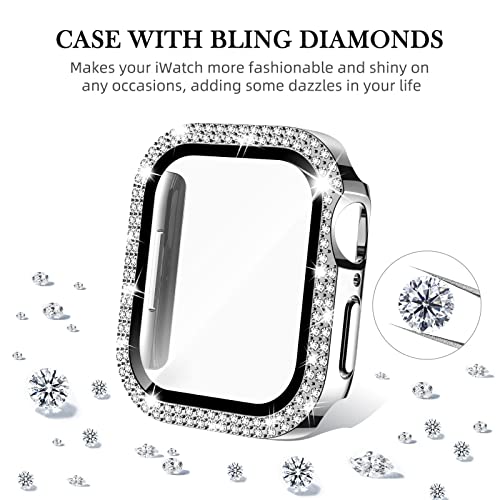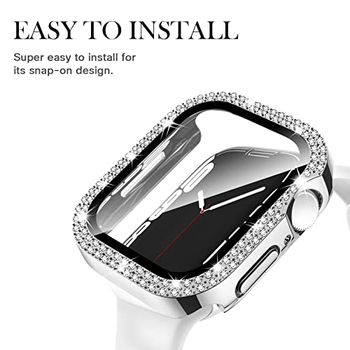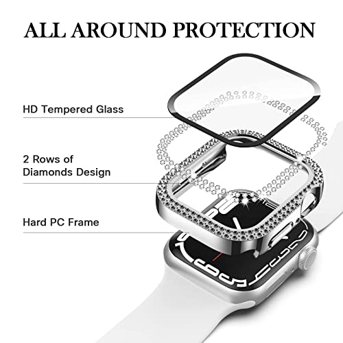 Adepoy - جراب لساعة آبل من السلسلة 7 مع واقي شاشة من الزجاج المقوى، اكصدام مزدوج مرصع بالكريستال وأحجار الراين الماسية، غطاء حماية نحيف للغاية من البولي كربونات الصلب من اديبوي مقاس 45 ملم، فضي