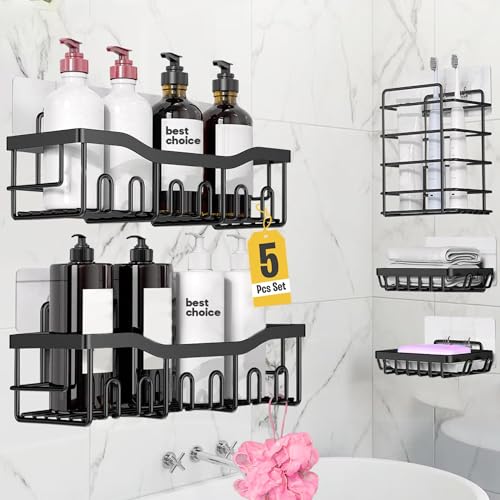 Yuroochii - علبة دش لاصقة، 5 عبوات من منظمات الحمام من الفولاذ المقاوم للصدأ مع حامل صابون وحامل فرشاة الأسنان، رفوف بسعة كبيرة بدون ثقب للتخزين في الحمام وديكور المنزل