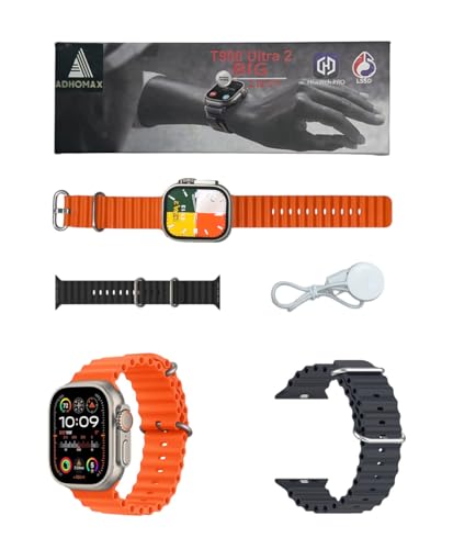 ADHOMAX - ساعة ذكية الترا 2 T900 بتصميم أنيق وشاشة HD عالية الدقة بدون حواف 2.2 بوصة واتصال قريب مدى وتتبع لياقة بدنية وبلوتوث وشحن لاسلكي متوافقة مع iOS وأندرويد للرجال والنساء من ادوماكس (سوار برتقالي وأسود)