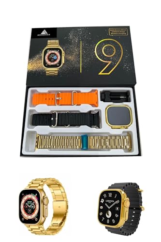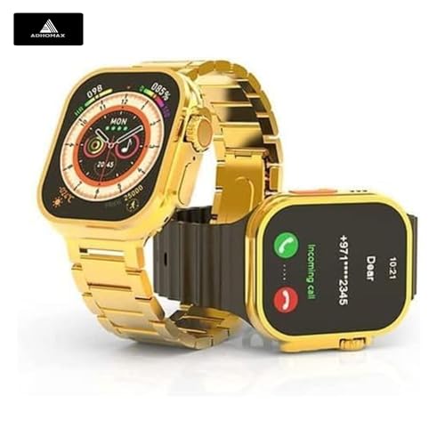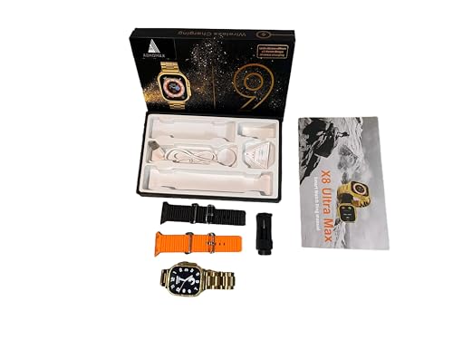 ADHOMAX - ساعة ذكية X8 الترا ماكس شاشة HD عالية الدقة 49 ملم تصميم أنيق مع 3 أساور وقفل لولبي ومتتبع لياقة بدنية ومعدل ضربات القلب والمكالمات وشحن لاسلكي وكاميرا والطقس IOS وأندرويد من ادهوماكس إصدار ذهبي (X8)
