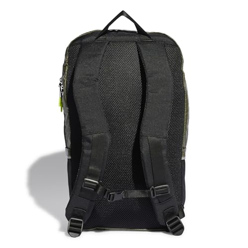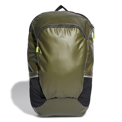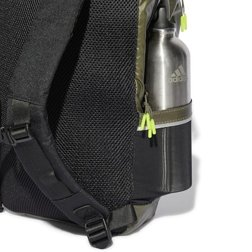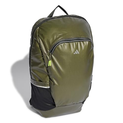 adidas - شنطة ظهر رياضية للجيم والتدريب باللون الزيتوني، مع تفاصيل باللون الأسود والفضي العاكس من اديداس، مخصصة للنساء