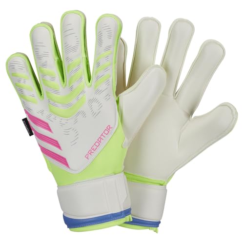 adidas - قفازات بريديتور جولي ماتش لحارس مرمى كرة القدم مزودة بحماية للأصابع للرجال والنساء من اديداس، أبيض وأصفر مخضر (لوسيد ليمون) ووردي فاتح (لوسيد بينك)، مقاس 7.5