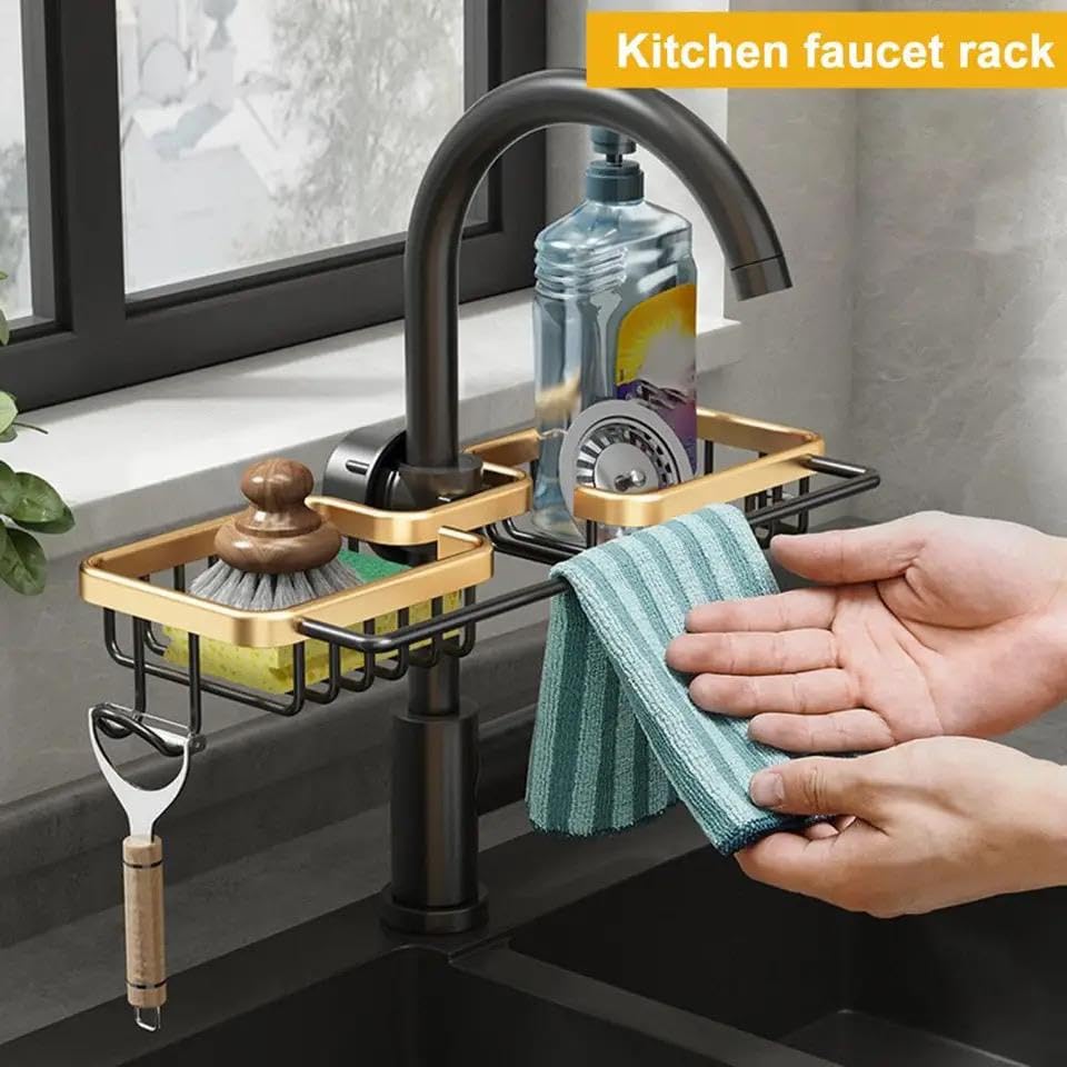 Generic - رف صنبور قابل للتعديل بمساحة من الألومنيوم خفيف فاخر باللون الأسود والذهبي للمنزل والمطبخ سلة تصريف خرقة - اسود وذهبي