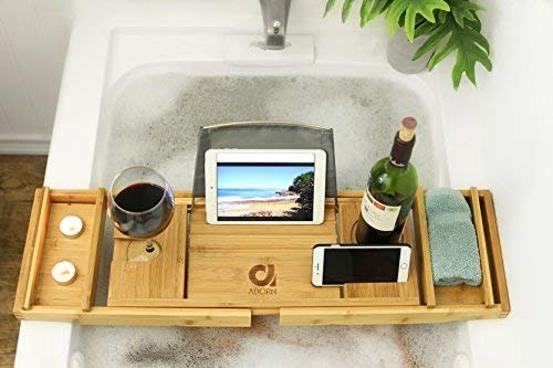 Adorn Home Essentials - صينية حوض استحمام من الخيزران من ادورن | صينية حمام مقاومة للماء/ قابلة للغسل مع كوب شفط | لون طبيعي | تتمدد حتى 109 سم