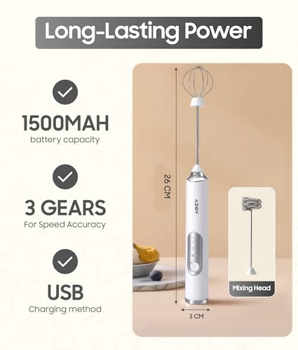 - 【سهلة الشحن والتنظيف】 تعمل أداة خفق اللبن الخاصة بنا ببطارية قابلة لإعادة الشحن بمنفذ USB بسعة 1500 مللي امبير في الساعة والتي لا تحتاج إلى استبدال. الشطف تحت الماء الجاري يكفي لتنظيف مضرب البيض على الفور.