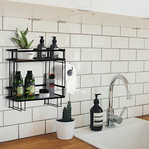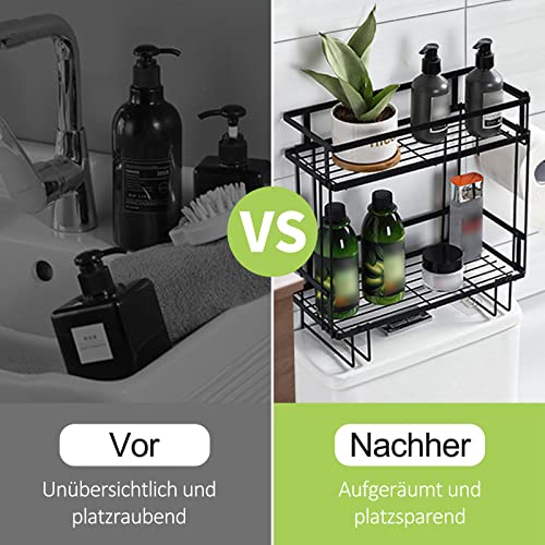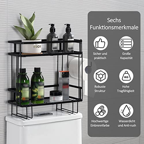 ADWOLT - رف تخزين ومنظم للحمام مكون من طبقتين فوق التواليت مزود بخطافات لتعليق بكرة الورق وقاعدة لاصقة وثقب منفصل ادولت معدن أسود