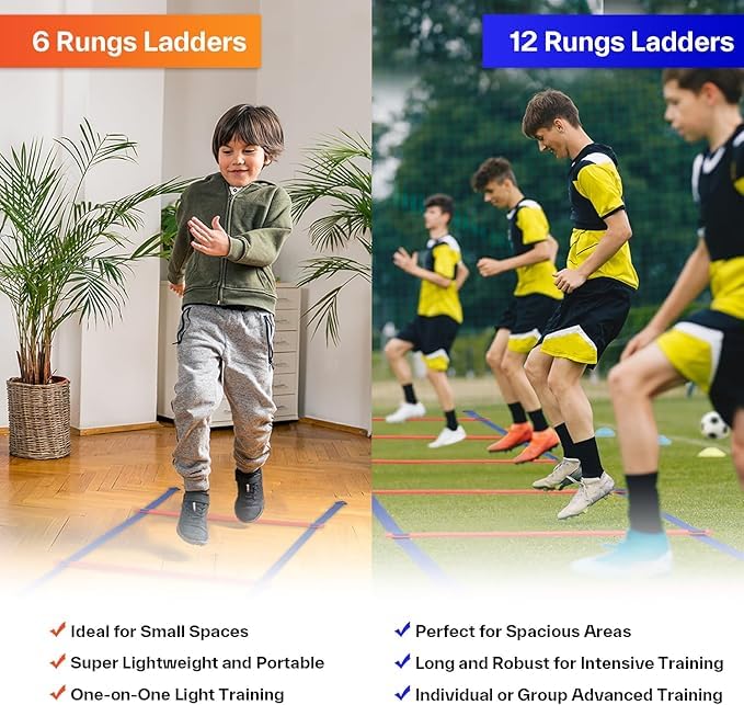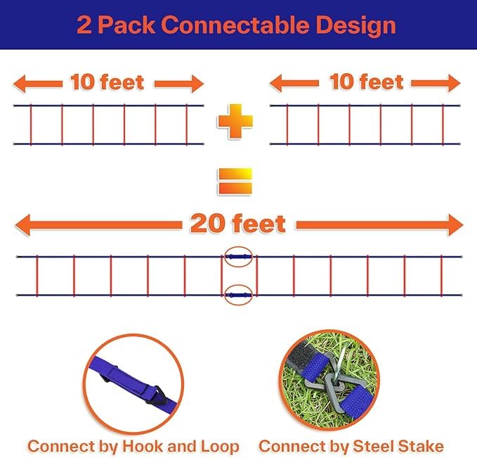 - إجمالي 12 درجة 20 قدمًا: تأتي العبوتان من معدات التدريب على خفة الحركة مع قطعتين من سلم خفة الحركة بطول 10 أقدام و6 درجات و8 قطع من الأوتاد الفولاذية التي تجعل السلم أكثر سطحًا وثباتًا على العشب، وحقيبة إضافية برباط لسهولة التعبئة