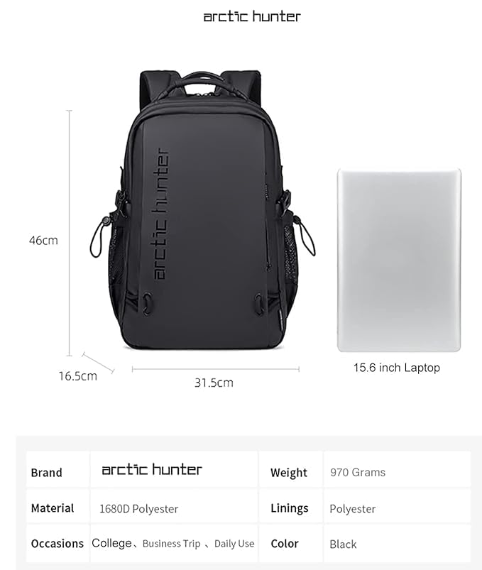 ARCTIC HUNTER AH - ارتيك هنتر شنطة ظهر للابتوب مقاس 15.6 انش للرجال خفيفة الوزن ومقاومة للماء ومناسبة للعمل والسفر والكلية والنساء اسود 46 سم × 31.5 16.5 عصرية من اه اركتيك هانتر عدد 1