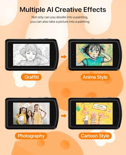 - 【240 رسمة إبداعية و16 تأثير بورتريه】تجعل 240 رسمة إبداعية هذه الكاميرا الديجيتال الذكية ممتعة في الاستخدام. يمكن للأطفال تتبع القوالب الكرتونية في وضع الرسومات أو تحويل الصور إلى أعمال فنية مرحة بأشكال مختلفة. بالنسبة لصور البورتريه، تضيف 16 تأثيرًا مختلفًا — مثل الكرتون والرسمة التخطيطية والمرسومة يدويًا — وتضيف لمسة إبداعية على كل لقطة. إنها طريقة ممتعة لإلهام الإبداع وتنمية اهتمام الأطفال بعالم التصوير.