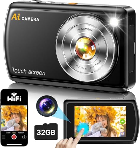 Generic - كاميرا ديجيتال للتصوير مزودة بواي فاي وذكاء اصطناعي وضبط تلقائي للتركيز وبعدستين وشاشة تعمل باللمس IPS مقاس 3.6 بوصة بدقة 1080P من نوع بوينت اند شوت وبطاقة ذاكرة 32 جيجابايت للأطفال (لون أسود)