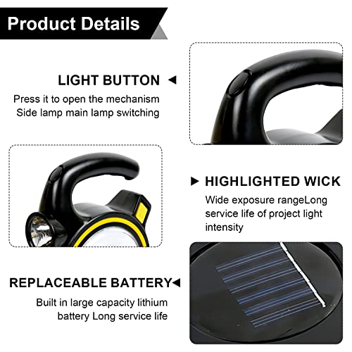 - الضوء الرئيسي والجانبي: هناك طريقتان لشحن مصباح العمل: الشحن عبر الطاقة الشمسية وشحن بمنفذ USB. يوجد 2 خرزة إضاءة: مصباح سي او بي رئيسي، مصباح ليد جانبي. تصميم مفتاح إضاءة إلكتروني يعمل باللمس، اضغط على مصباح إضاءة سي او بي الرئيسي، يعمل باللمس مصباح ليد مزدوج الجانب.