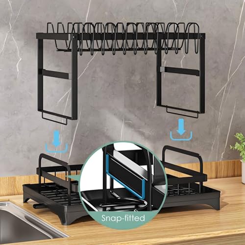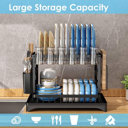 AIDERLY - رف تجفيف الاطباق لطاولة المطبخ من طبقتين من الحديد مع سلة ادوات مائدة قابلة للازالة، اسود