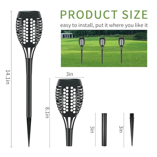 - Gorgeous Flickering Flame: Solar outdoor lights flicker a gorgeous dancing flames, a safe alternative to the real “flames”. Through Upgraded 12LEDs, it casts a safe, soft and mood-enhancing glow for garden decor. These are mini torches with the total length 20.6 inches.