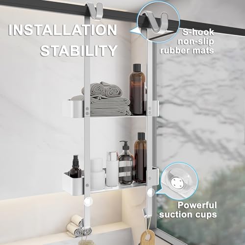 AIGOCITY - رف دش للتعليق من ايجوسيتي بدون ثقب لتعليق ابواب الدش الزجاجية مع 6 خطافات للباب الزجاجي اطار الستانلس ستيل فضي
