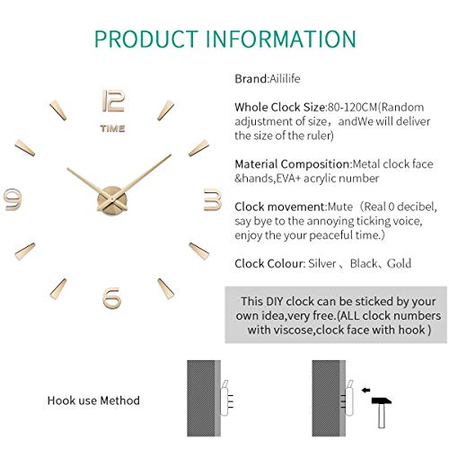 AILILIFE - ساعة حائط كبيرة ثلاثية الأبعاد يمكنك تركيبها بنفسك مع ستيكر لاصق بتصميم مراية بدون إطار لتزيين المنزل وغرفة المعيشة النوم والمكتب من ايلي لايف لون ذهبي تناظري أكريليك