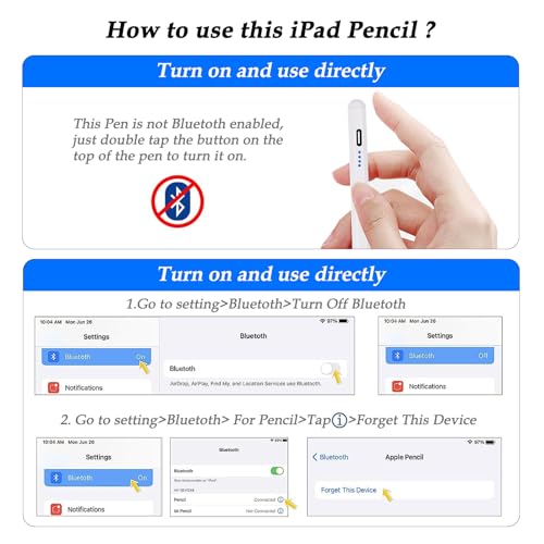 - 【إذا وجدت أنه لا يعمل بعد التشغيل】 يرجى إيقاف تشغيل البلوتوث أو إلغاء تفعيل القلم القديم: الإعدادات > البلوتوث > لقلم آبل > اضغط على "i" > انس هذا الجهاز