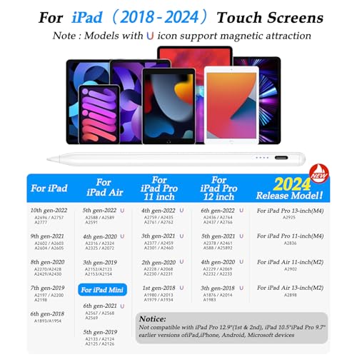 - 【لجهاز ايباد 2024-2018】تم تصميم قلم ستايلس هذا ليتوافق مع مجموعة من موديلات اي باد من 2024 إلى 2018، بما في ذلك ايباد الجيل العاشر/التاسع/الثامن/السابع/السادس؛ ايباد برو 28 سم/33 سم (الجيل الثالث وما بعده)؛ اي باد ميني الجيل الخامس/السادس؛ وايباد اير الجيل الثالث والرابع والخامس.