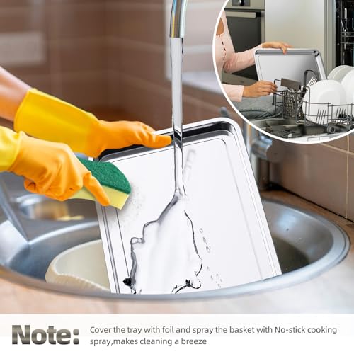 - سهلة التنظيف - صينية الاير الفراير ورف الفرن سهلة التنظيف للغسيل اليدوي أو غسالة الأطباق. انقعها في الماء الساخن بعد الاستخدام، ثم استخدم الإسفنجة لمسح بقايا الطعام. يمكنك وضعها في غسالة الأطباق. قم بتغطية صينية القلي هوائية برقائق معدنية ورش سلة القلي الهوائية برذاذ الطبخ غير اللاصق يمكن أن يساعد بشكل معيب على منع الالتصاق.
