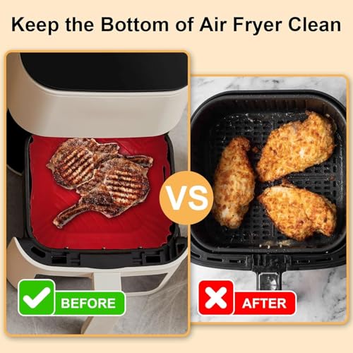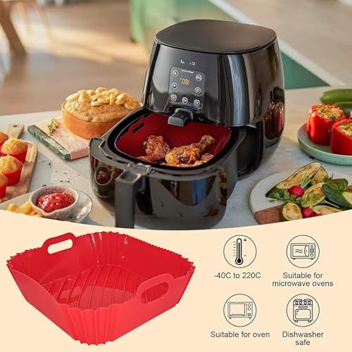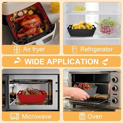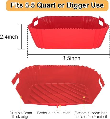 - بطانات القلاية الهوائية: بطانة سيليكون للمقلاة الهوائية مصنوعة من السيليكون الآمن غذائيًا والخالي من البيسفينول أ. مادة مقاومة للحرارة العالية تتحمل حتى 271 درجة مئوية. بطانات مقلاة هوائية مربعة من السيليكون قابلة لإعادة الاستخدام، طول جانبي 21.6 سم، ارتفاع 6 سم، يمكن أن تستوعب المزيد من الطعام اللذيذ، مناسبة للقلايات الهوائية سعة 3.8-7.6 لتر.