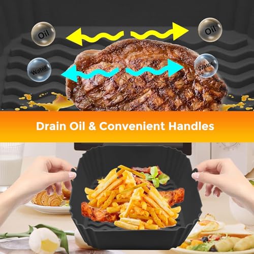- 【تصميم مخصص للتوافق المثالي】 أبعاد هذا المنتج 8.67 × 5.9 × 2.68 انش، وهي عالية بما يكفي لترك أي مساحة من داخل المقلاة مهدرة. يأتي الجزء السفلي من البطانة مع شرائط سيليكون مرتفعة، والتي تفصل الطعام عن الزيت المنتج أثناء الطهي وتقلل من تناول الدهون. كما أنه يساهم في دوران الهواء داخل البطانة مما يساعد على تقليل وقت الطهي وتوفير فواتير الخدمات.