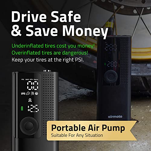 Airmoto - منفاخ إطارات محمول، حزمة واحدة، ضاغط هواء محمول لنفخ الإطارات مع مجموعة طاقة للشحن في المنزل وعلى الطريق - مضخة هواء لاسلكية لإطارات السيارات والموتوسيكلات والدراجات من ايرموتو