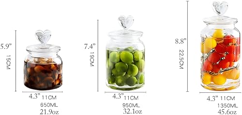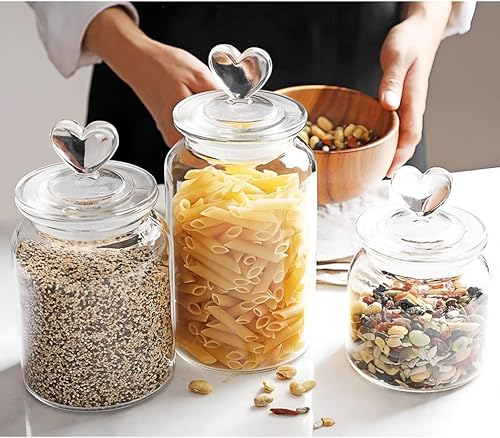 Generic - حاوية طعام زجاجية محكمة الغلق - برطمانات زجاجية شفافة متوسطة الحجم مع غطاء على شكل قلب، مجموعة من 3 قطع (650 مل، 950 مل، 1350 مل) مثالية لتخزين المطبخ والمخزن وحفظ الطعام الطازج