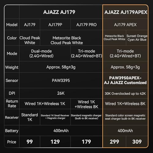 - [اجاز فلاجشيب Aj179 ابيكس] تستخدم سلسلة اجاز AJ179 مستشعر PAW3950 المتطور من بيكس ارت الذي تم ضبطه بدقة للحصول على أقصى أداء. أقصى حساسية 30000 نقطة لكل بوصة لـ 179 نقطة لكل بوصة. يمكن رفع تردد المعالج AJ179 ابيكس إلى 42000 نقطة لكل بوصة بالإضافة إلى سرعة تتبع 750 IPS وتسارع 50 جيجا. هذه الميزات تجعل AJ179 ابيكس لا مثيل لها في هذا المجال من خلال توفير دقة وسرعة لا مثيل لها.